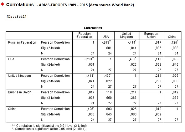 Nevertheless, the concentrated localization of the conflicts, the asymmetry in power, resources and propaganda, and also the emotionally ideological (most often in the media) color, cant cover the linear logic of the preconditions, which interpreted in whatever way still stay mostly as economic phenomena. The arms export remains an indicative element of this industry. But the market is a one whole. It is well shown in the opposite dependence on exports of the global powers, as a part of the intensity of military relations among the basic geopolitical units.