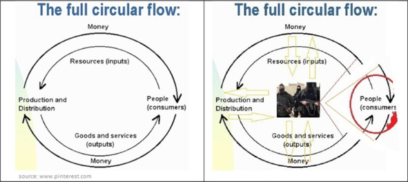 In our times the market is usually interpreted as a main norm of the generally recognized value systems in the developed societies. From here the attention is focusing on the process of exchange, as its essential element. We can immediately notice the base connection which is either rending or transforming beyond recognition in the military confrontation, regardless if we look at it as a global (geopolitical) plan or on a local level. “To get a good or money that do not belong to you has been possible even in then, with military actions – you kill, enslave and grab.” [5] This thought of the professor Neviana Krysteva, put as an antithesis of the market relations, is referring to a distant past time period, but is an applicable alternative at every time, exactly as a form of direct elimination of the exchange from the market structure. In this way in the zones of military confrontations the connections of the market relations are broken, the whole economic structure is destroyed and drastically changed; the influence on the market structure and the communication with the consumers is only an aspect of the overall collapse of the social system, build on the civilizations norms, equilibrium relations and generally accepted values.