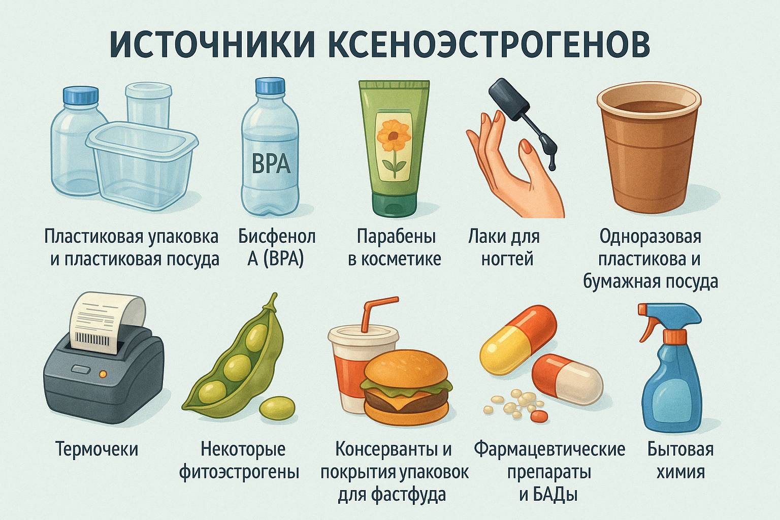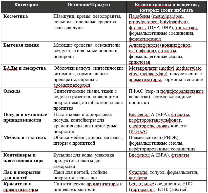 Ниже представлены рисунок и таблица с основными источниками ксеноэстрогенов. Изучив их, вы сможете осознанно выбирать продукты, косметику и бытовые средства и избегать компонентов, повышающих токсическую нагрузку.