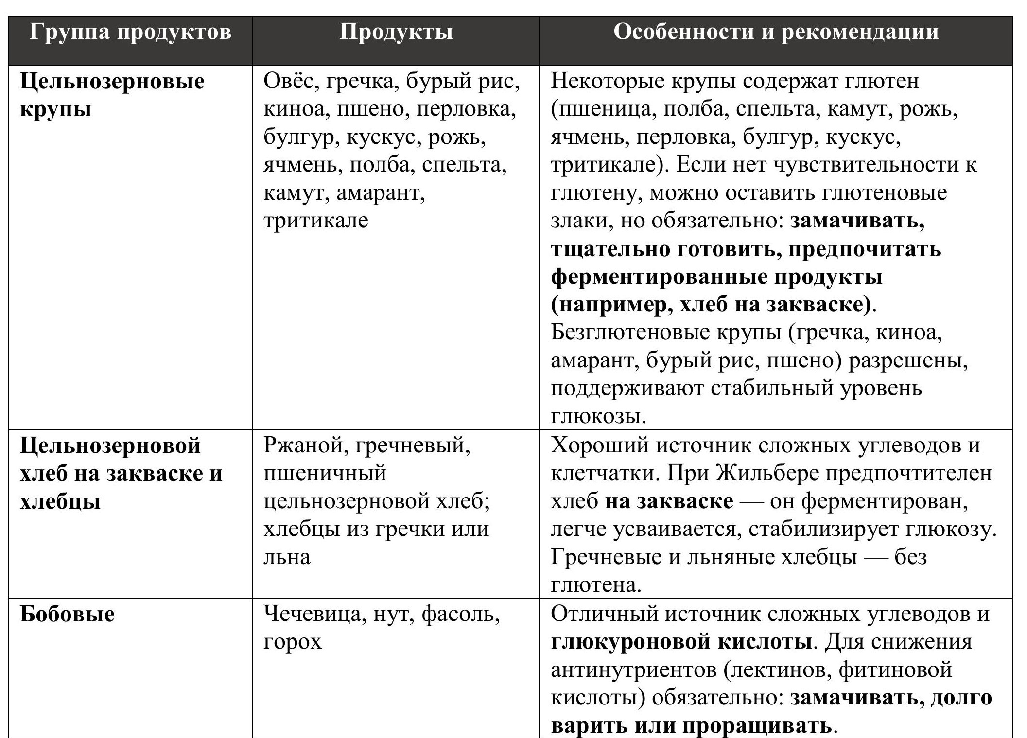 1. Цельнозерновые крупы: овёс, гречка, бурый рис, киноа, пшено, перловка, булгур, кускус, рожь, ячмень, полба, спельта, камут, амарант, тритикале. Некоторые из этих круп содержат глютен (например, пшеница и её виды – полба, спельта, камут, а также рожь, ячмень, перловка, булгур, кускус, тритикале). При синдроме Жильбера часто нарушена работа ЖКТ, поэтому глютен рекомендуется минимизировать или исключить. Однако если по генам HLA-DQ нет чувствительности к глютену, можно оставить глютеновые злаки в рационе – важно предварительно замачивать их, тщательно готовить и отдавать предпочтение ферментированным продуктам, например, хлебу на закваске. Такие продукты медленно перевариваются и поддерживают стабильный уровень глюкозы.