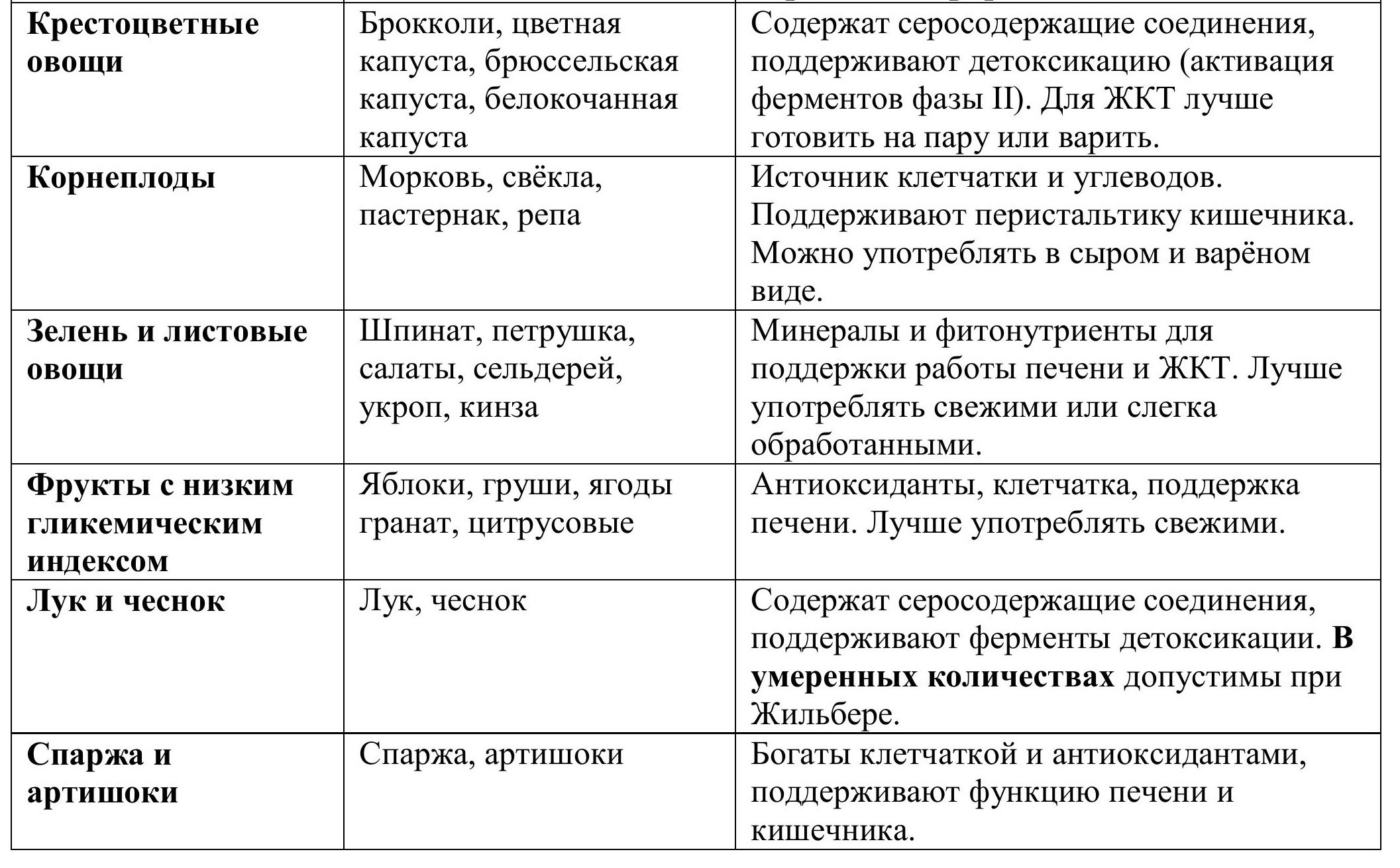 На рисунке ниже представлены основные из них: цельнозерновые крупы и хлеб на закваске, бобовые, корнеплоды, крестоцветные и листовые овощи, спаржа, артишоки и фрукты с низким гликемическим индексом. Регулярное включение этих продуктов в рацион создаёт условия для стабильной работы фермента и полноценного процесса детоксикации.