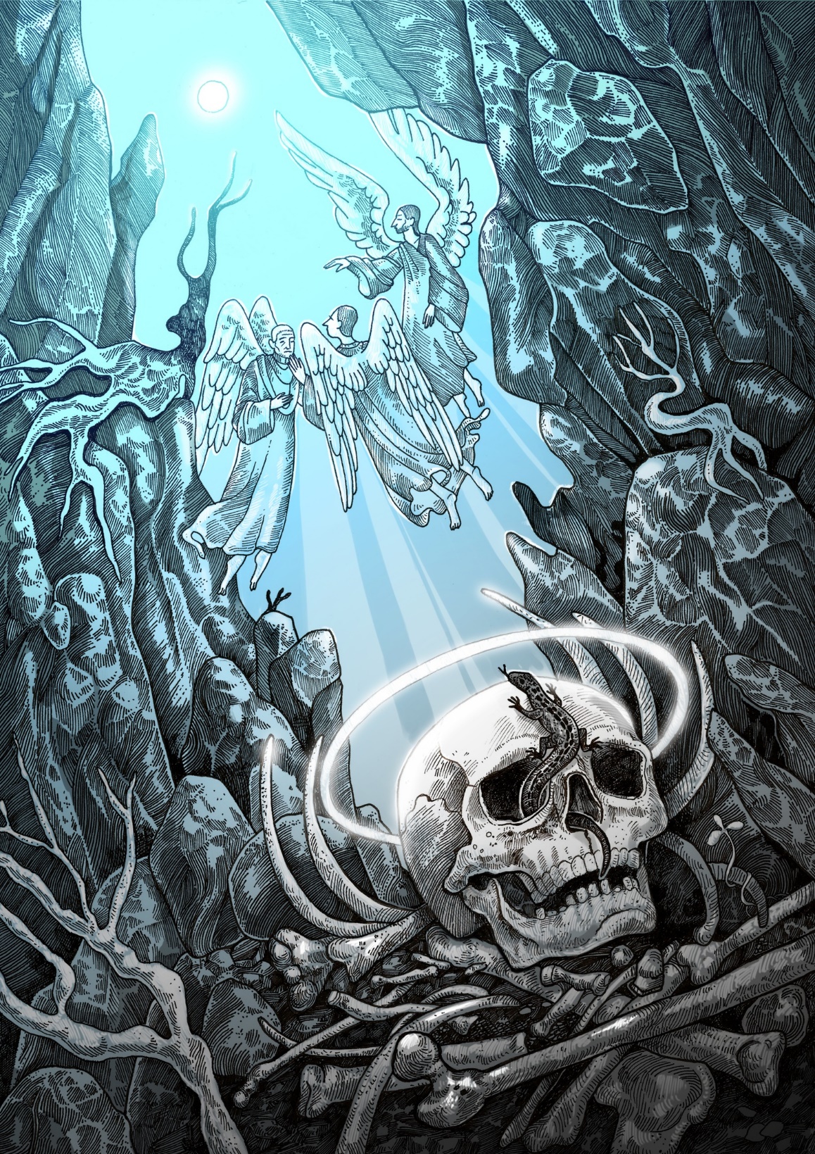 Дал им ангел свои крылья, и взмыли они в небеса, впитавшие от его плоти и крови ангельской силы, а сам он остался внизу, ждать на земле. Но годы шли, а путники так и не возвращались. А череп ангела так и лежит там, уставившись пустыми глазницами в небо, в надежде что ему вернут его крылья.
