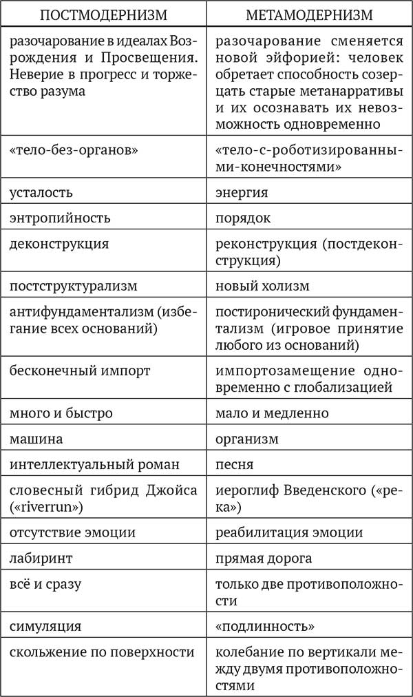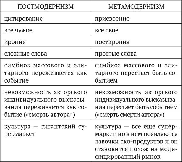 Умберто Эко писал: «…постмодернизм – не фиксированное хронологически явление, а некое духовное состояние, если угодно, Kunstwollen (воля искусства) – подход к работе. В этом смысле правомерна фраза, что у любой эпохи есть собственный постмодернизм, так же как у любой эпохи есть собственный маньеризм»[35]. Добавлю – и собственный метамодернизм.