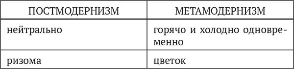 Метамодерн не манифестирует конец культуры, и – в отличие от постмодернизма – не проникнут эсхатологическими настроениями. Метамодернизм – это цветок, выросший над ризомой: о ризоме помнят только его корни, но сам он тяготеет вверх.