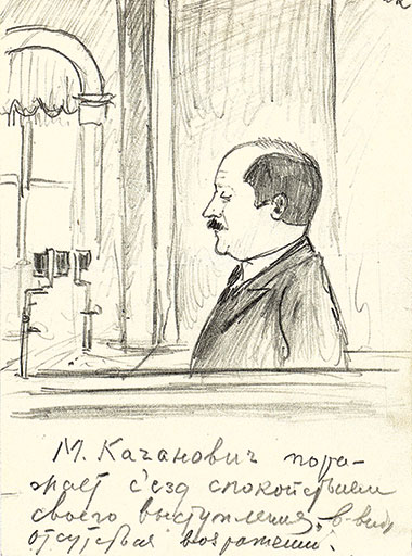 В. И. Межлаук. Рисунок «М. Каганович поражает съезд спокойствием своего выступления, ввиду отсутствия возражений»