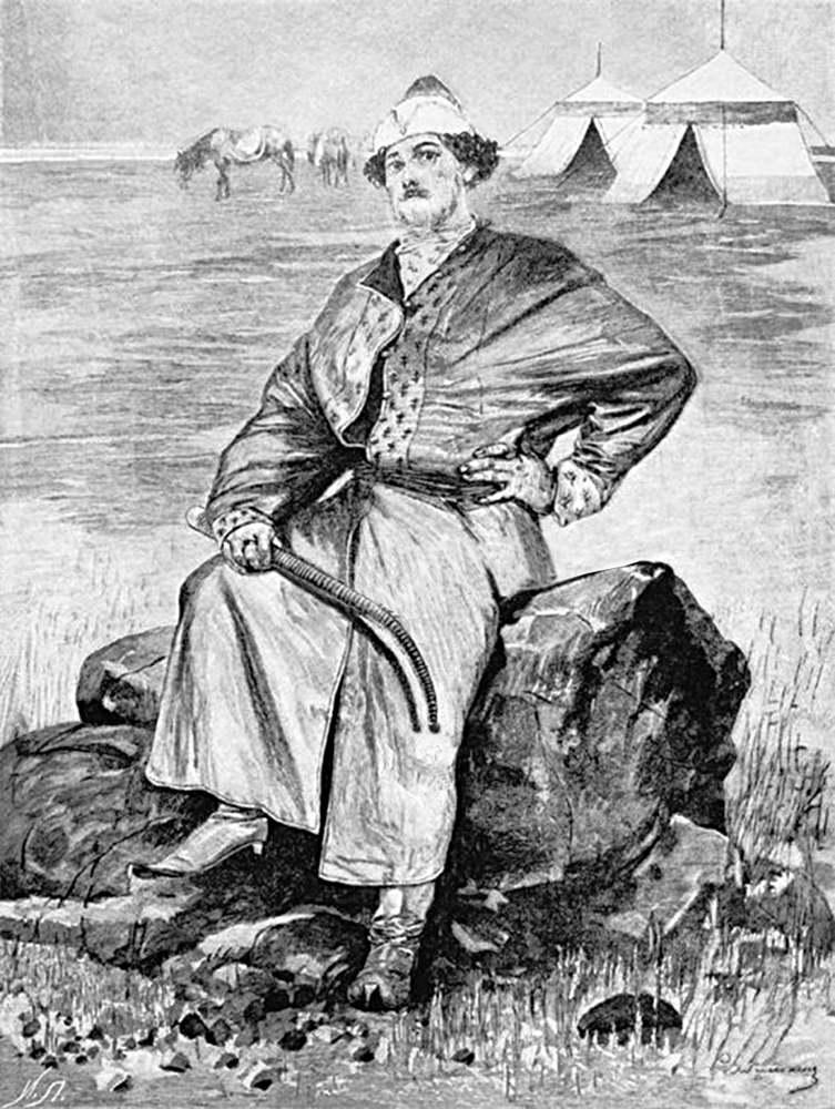 Среди брёвенчатых и плетнёвых построек, крытых лубком или соломой, выделялись характерные круглые войлочные юрты с куполообразными крышами, и большие, красные переносные палатки, привязанные к рядам кольев. Немного поодаль, ближе к тёмному бору, стояло рядом до 20 юрт, из лучшего белого войлока, многие из них были изукрашены шитьем и цветными вставками, а перед самой большой из них, сплошь покрытой чёрно-красной вышивкой, торчало врытое в землю зелёное знамя, увенчанное полумесяцем, и перед входом стояли два смуглых, высоких татарина, в парадных кафтанах, с большими кривыми саблями наголо.