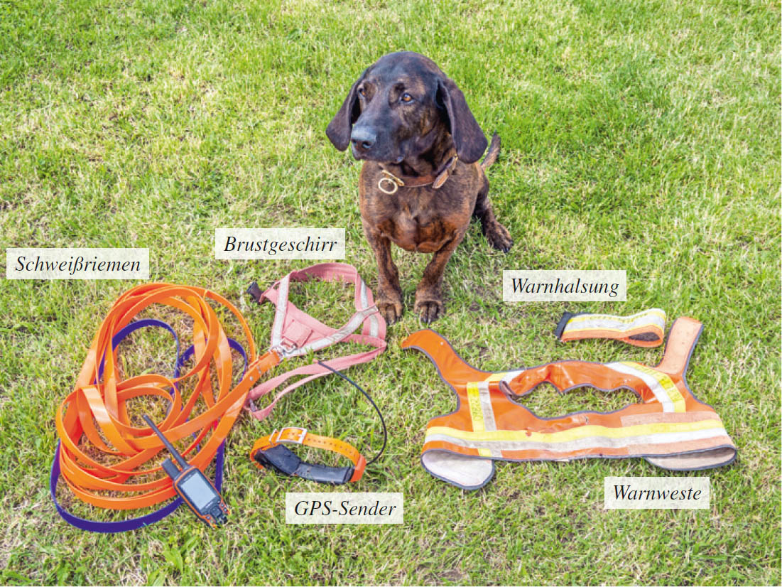 Der Schweißriemen sollte eine Länge von etwa zwölf Metern haben, bei zu kurzen Riemen kann es sein, dass Sie Ihren Hund gerade in der Anfangsphase, wenn er Platz und Raum zum Festsaugen braucht, stören. Ein zu langer Riemen „verwurschtelt“ sich noch leichter in einer Dickung, Sie haben schon mit einem Zwölf-Meter-Riemen genug damit zu tun, Ihren Hund zu befreien. Der Riemen sollte aus festem, aber leichtem Material sein, auf keinen Fall aus Leder. Dieses Relikt aus früheren Zeiten darf man getrost aufgedockt zu Hause ins Jägerzimmer hängen, denn Lederriemen werden bei Nässe viel zu schwer und zu rutschig. Manche wenige Hundeverbände erwarten bei verschiedenen Prüfungen oder Veranstaltungen, dass man seinen Hund am aufgedockten Schweißriemen führt, hierfür taugt er gerade noch. Ich persönlich habe mir vor kurzem einen aus einer Art weichem Kunststoff gekauft, er ist wunderbar leicht, verhakt sich nicht und hat eine orangene Warnfarbe, wobei der letzte Meter blau ist.
