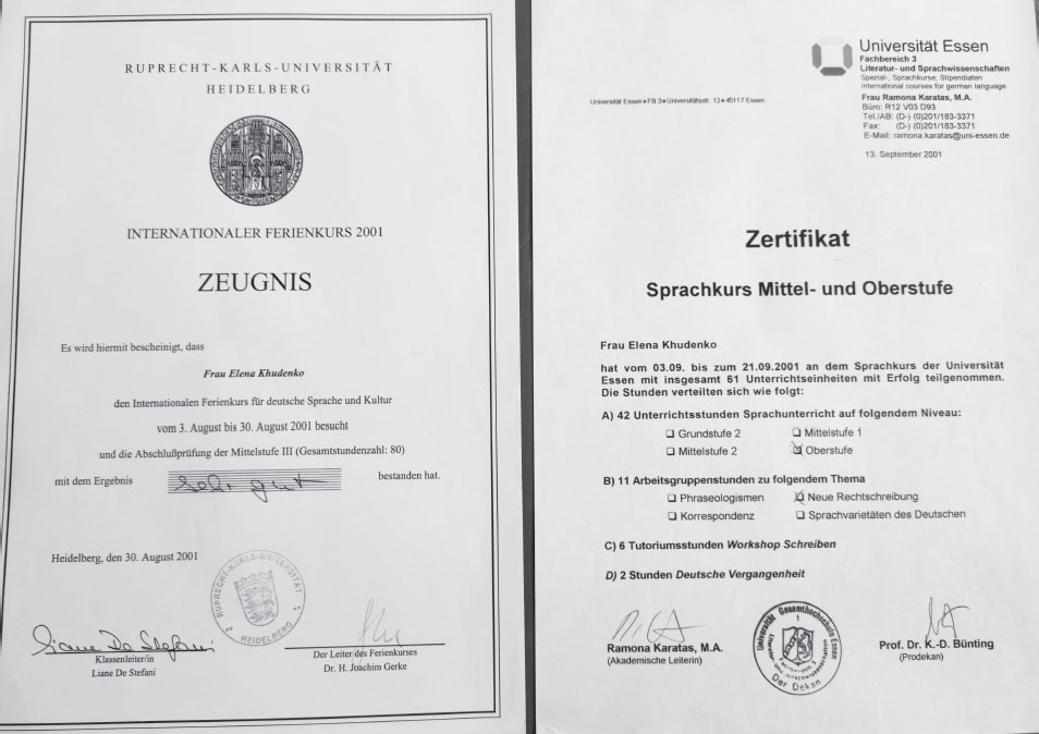 В университете мне повезло получить две замечательные возможности, связанные с немецким благодаря сотрудничеству между вузами наших стран. В 2001 году я выиграла олимпиаду по немецкому языку и в качестве приза получила место на курсах в университете г. Эссен. В том году вообще случился лингво-джекпот, потому что я сумела вписаться еще в один международный летний курс в университете Ruprecht-Karls-Universität Heidelberg. В итоге август-сентябрь 2001 года я изучала немецкий в языковой среде в компании студентов со всего мира. И это был бесценный опыт. Именно на курсах я очень остро ощутила значение языка как пропуска в другое измерение. В моей группе были студенты из Польши, Венгрии, Японии, Великобритании, США, Италии и Израиля. Очень ярко помню эти переходы с родного языка на «общий», чтобы поговорить друг с другом. Помню, как проходя через толпу студентов, время от времени «проваливалась» в разговор, понимая, о чем он. А еще здорово, когда ты говоришь на своем родном языке, а друг – на своем (например, чешском и словацком, польском и русском), и вы друг друга понимаете.