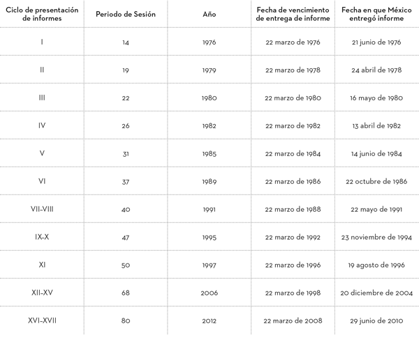 Tal como se observa en la tabla 1.1, el estado mexicano debió presentar su informe el 22 de marzo de 1988; pero no lo hizo hasta el 22 de mayo de 1991, retraso que, como veremos, se vuelve una constante en las evaluaciones posteriores, lo que pone en evidencia lo poco importantes que son para el estado estos procesos de examinación.