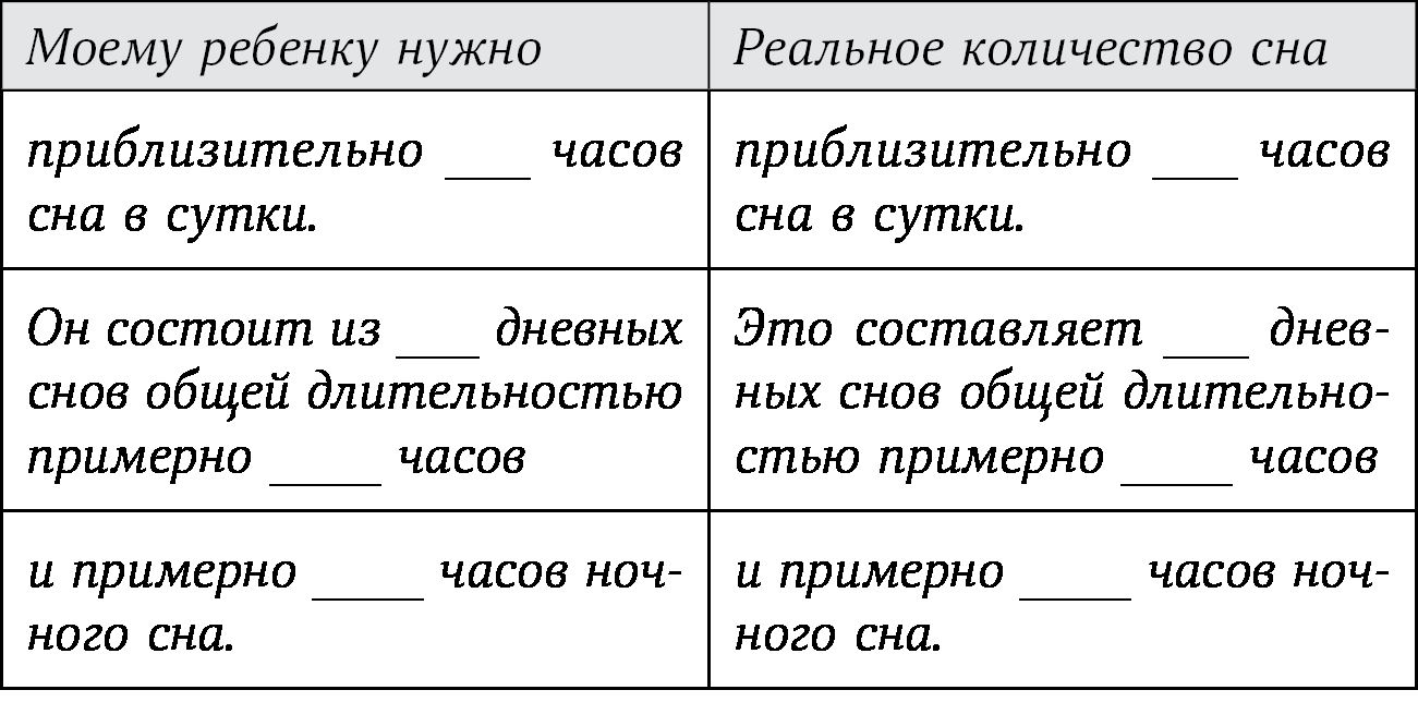 Используя эту таблицу, вы можете составить сравнительную таблицу того, сколько часов сна требуется вашему ребенку и сколько он спит на самом деле: