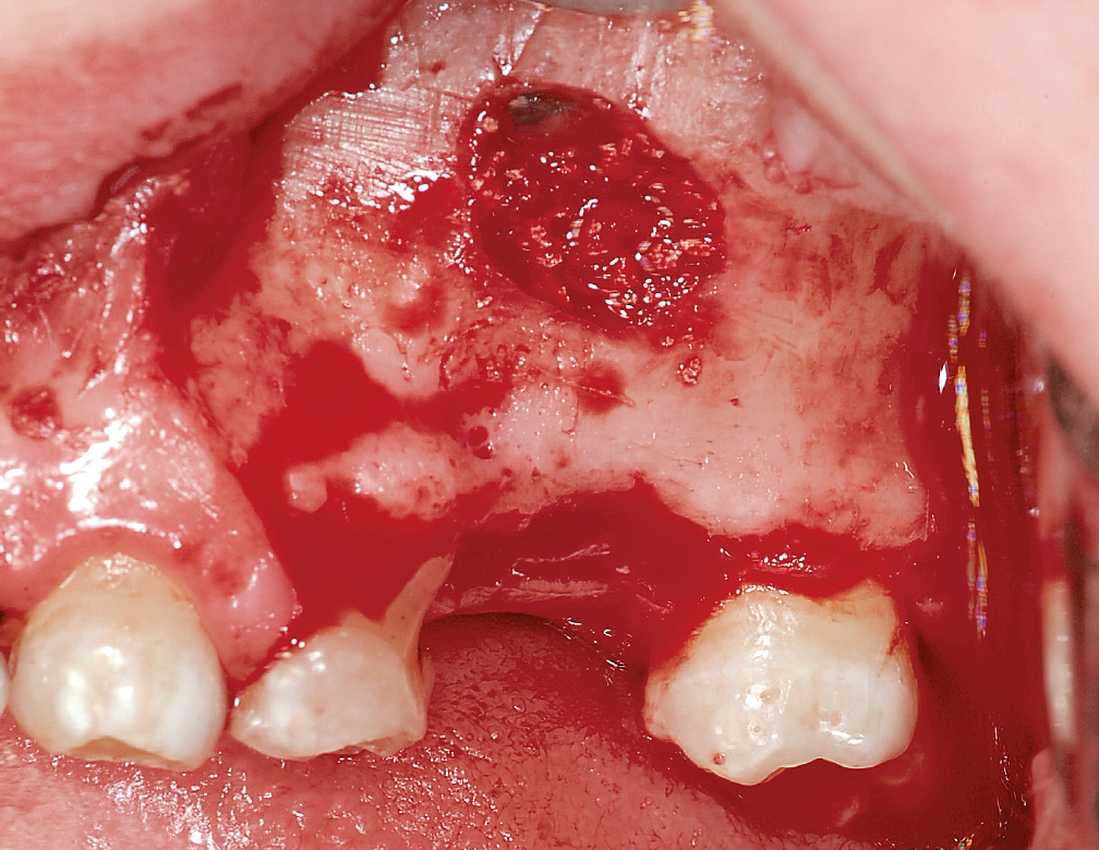 Im Rahmen der „Consensus Reports“ 2015 der European Association for Osseointegration (EAO) wurde kein ausreichender Nutzen für die präoperative Antibiotikaprophylaxe im Fall einfacher Implantationen bei gesunden Patienten gesehen. Insbesondere im Hinblick auf das Problem der Antibiotikaresistenzentwicklung und das Vorkommen von unerwünschten Nebenwirkungen wird daher die Empfehlung zur perioperativen Antibiotikaprophylaxe kritisch betrachtet. Für kompliziertere Fälle konnte hingegen ein Nutzen der Prophylaxe zumindest nicht ausgeschlossen werden27,28 (Abb. 1). Eine prolongierte Antibiose über 3 bis 5 Tage kann bei Augmentationen erwogen werden, denn es hat sich gezeigt, dass unabhängig von der Art der Knochenentnahme eine bakterielle Kontamination des Augmentationsmaterials nahezu unvermeidbar ist (Abb. 2). Auch bei der Verwendung von Knochenersatzmaterial sollte eine prolongierte Antibiose über einige Tage verordnet werden, da es sich primär um ein Fremdmaterial handelt (Abb. 3).