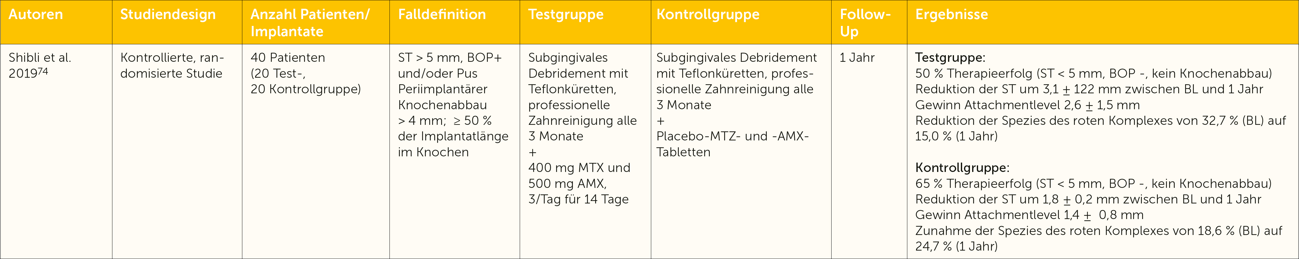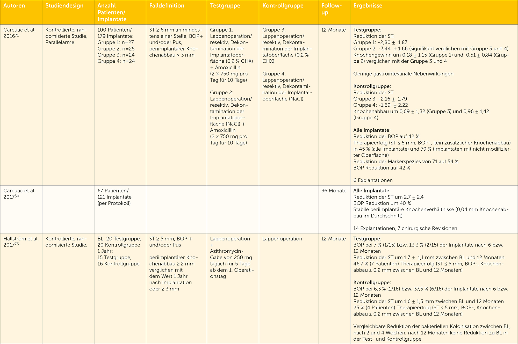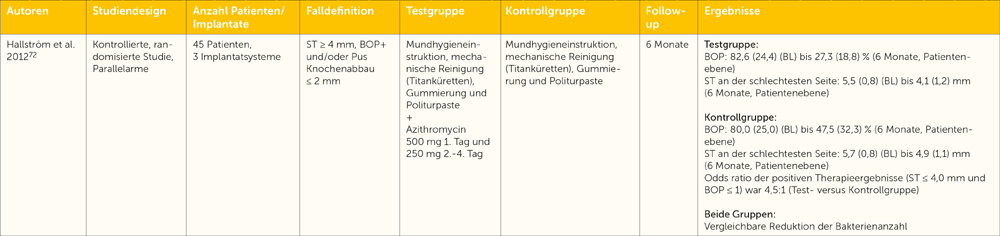 Bislang sind nur wenige kontrollierte, randomisierte Studien bekannt, die sich mit der Fragestellung „Wie ist die klinische Wirksamkeit einer adjuvanten, systemischen antimikrobiellen Therapie im Vergleich zu konventionellen Therapieverfahren der periimplantären Mukositis (nichtchirurgisches Therapieverfahren) und der Periimplantitis (nichtchirurgisches und chirurgisches Therapieverfahren)?“ auseinandersetzen50,71–74.