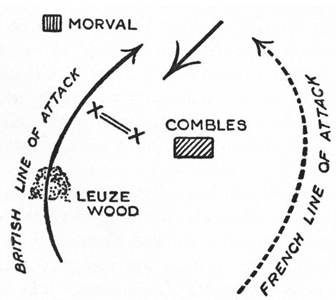 The plan on this part of the front was to surround Combles by joining the French on the far side. The junction of two armies of different nationalities might always be considered a point of weakness, and the movement itself was one of which the enemy could take advantage. Lord Cavan explains the position very clearly with a small rough sketch: