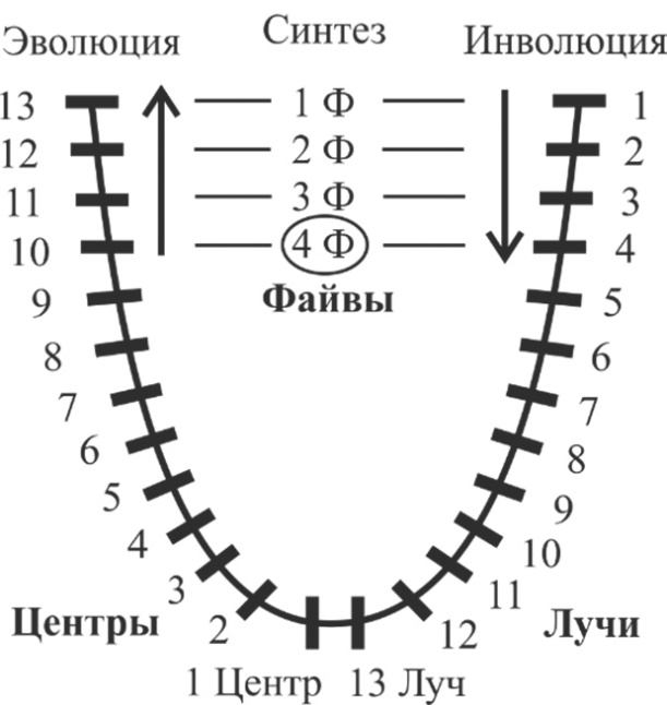 Значит, система. У вас должна была быть система парабола. Вот это первый Луч. И это то, что называется инволюцией. От Отца идёт. Второй Луч, третий, 13-й. А система эволюции в обратном эффекте начинается с первого Центра: первый Центр Жизни, и заканчивается 13‑м Центром, 13‑м Центром Огня Духа. Увидели? Идёт соответствие первого Луча и 13-го Центра. И получается первый Файв. Второго Луча и 12-го Центра – получается второй Файв. Третьего Луча и 11-го Центра – получается третий Файв. И четвёртого Луча, что вас касается, и 10-го Центра – получается четвёртый Файв.