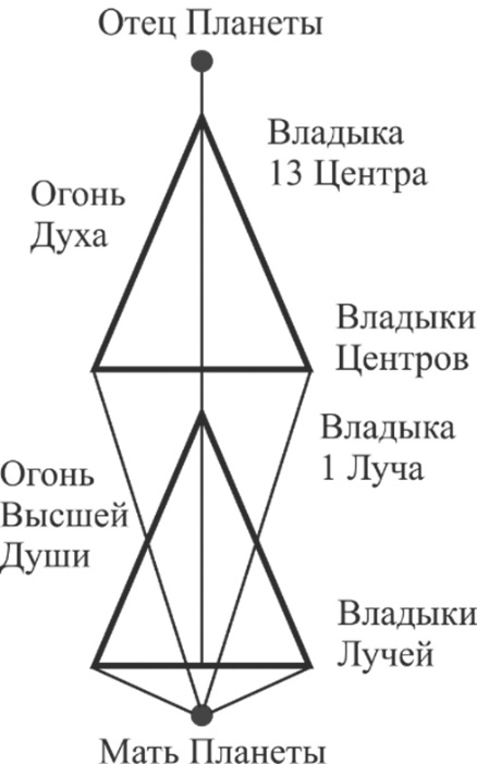 Но Луч – более нижестоящий уровень, это инволюционный уровень на Планете, чем Центр. Поэтому в 13‑м Центре стоят Владыки Лучей, Владыки Центров. Понятно. Это конус: Владыки Лучей и конусом Владыка первого Луча. 12 вокруг одного. Над ними Владыки Центров и конусом Владыки 13-го Центра. Над Владыкой 13-го Центра Отец Планеты, который конусовидно развёртывает два потока. Один поток вот так (показывает на схеме).