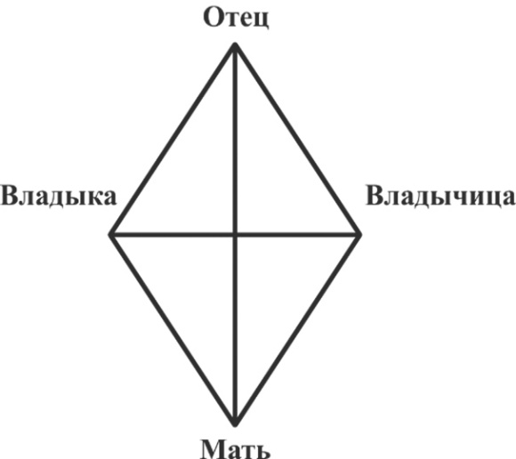 И Мать в обратном эффекте, увидели ромбик, развёртывает материю на Планете – в этом механизме. И вот знак Иерархии сейчас – это знак ромбика: Отец-Мать-Владыка-Владычица, любого Центра или Луча. И синтез этих устремлений – это наше с вами ученичество, крест, вот мы в центре, чтобы слить Отца-Мать, мы все идём к Отцу, да, и Владыку-Владычицу, которые нас обучают в развитии. Вот ромбик. Вот эта схема принципиальная. Она очень важна. Эта схема, в принципе, нашей Магнитной работы.