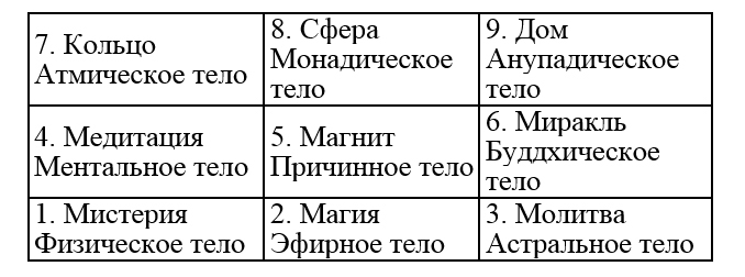 Таблица – это технология духовных практик, которые существуют в Иерархии. Это Закон Отца, когда одна практика вытекает из нижестоящей и восходит в вышестоящую. «То, что внизу, то и вверху».