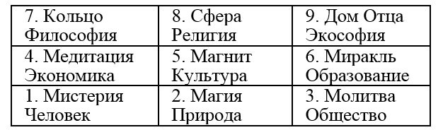 Теперь проводим вертикальную черту: Магия, Магнит, Сфера – 2, 5, 8, взаимосвязь. Вторая линия: Мистерия, Медитация, Кольцо – 1, 4, 7. И Молитва, Миракль, Дом – 3, 6, 9.