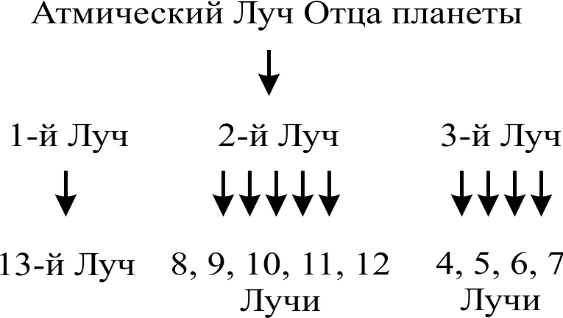Другими словами: Отец посылает тройной импульс из своего Единого Луча, Атмического, в 1-й, 2-й и 3-й Луч. 1-й Луч пропускает импульс через себя и отдает только 13-му такой же импульс, поддерживая Силу Матери. 2-й Луч пропускает импульс через себя и распределяет это на 5 Лучей – 8, 9, 10, 11 и 12-й Луч. И 3-й Луч распределяет на 4 Луча. Раньше этих Лучей не было, шести, и было 7 Лучей.