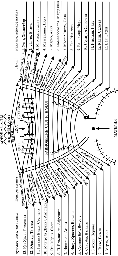 Схема Отец-Мать-Сын: здесь были только Владыки, которые учились у Христа. А теперь идёт Четверица. Появляется Дочь, как Владычица Луча. И идёт Отец-Мать-Сын-Дочь. И получается, Христос и Христина. Причём Христина управляет всей Высшей Душой, потому что 6-й план – это центровка Высшей Души. И мы знаем, что Владычица Афродита, которая является Владычицей Иерархии, с позиции человеческого Глобуса, она владеет Высшей Душой планеты в человеческом варианте. А Павел Венецианец, который является Владыкой Иерархии человеческого Глобуса, является Владыкой Лучей человеческого Глобуса.