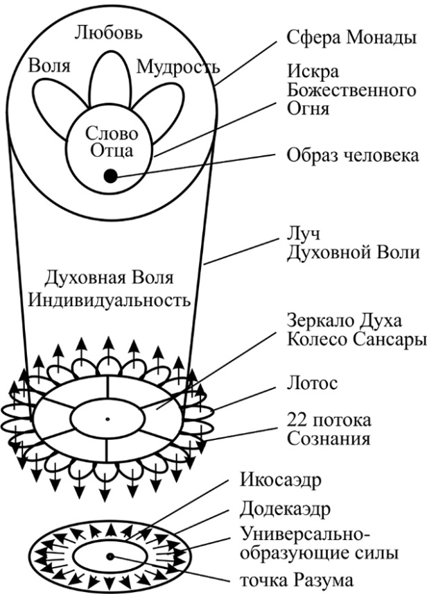 Итак, сферы родились, сферы организовали некое пространство и вот тут появляется первая энергия, которую вообще человек имеет, это Луч. Вот так со всей Монады вниз начинает идти Луч Духовной Воли. Один. Одна Монада – один Луч. Напрямую из Монады вот так идет Луч. В принципе на схеме это показано, но почему-то никто не представляет в голове, судя по последней вчерашней практике, как это происходит внутри человека. Луч бьет на лепестки, через Колесо Сансары, которое вот здесь вертится, вот здесь он бьет на зерцало Духа, ну, чашечку внутри Лотоса. Здесь крутится Колесо Сансары, и Луч распределяется на каждый лепесток, образуя 22 потока. Вот они вместе тут. Вот из Луча Духовной Воли человек из одного Луча делится на 22 потока Сознания. Ни 10, ни 12, ни 13 – установлено универсальное единое количество – 22. У кого меньше, тот еще не развит. У него все равно 22, но остальные – в потенциализации. Почему меньше? Потому что из этих 22 потоков мы спускаемся в Буддхический план и растет икосаэдр или 20-гранник. Почему 20-гранник? Потому что один поток, то бишь двадцать первый, который известен как Аркан «Дурак», является центровкой, а 22-й, известный как «Мир»… Хотя в некоторых Арканах это по-другому строится, но мы говорим об Иерархических Арканах, где 21-й «Дурак», 22-й «Мир» или ноль. Это Арканы Владимира Шмакова, там это давалось и правильно давалось. Это истинно изначальные Арканы. Где 21-й начинает стыковать двадцать вокруг себя как звездочку, а 22-й окутывает эту двадцатку, создавая икосаэдр.