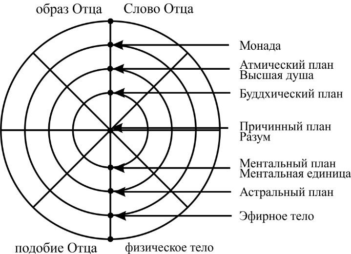 Мы заканчиваем 2-ю ступень экософии жизни. Эко – дом, София – Мудрость. Так вот представьте всю эту систему, что все это вместе взятое, в конечном счете сбалансировано и строит Дом человека с центровкой в Разуме с Высшей Душой из трех тел, четырьмя телами внизу: Физическим, Анупадическим здесь и Монадой Матери здесь. Примерно. Это собственно Слово Отца – Анупадический план, это Монада, это Высшая Душа – Атмический план. Вторая линия это Буддхический план, это слияние Атмы и Буддхи между собой. Потом идет собственно Ментальный план, потом идет Астральный план, Атмический связан с Астральным вот такими линиями восприятия. Увидели? То есть вот это ментальная единица, а это астральные чакры, и Атмический план – Воля Отца распределяется до Астрала, но существует сама по себе вот здесь. Буддхические энергии распределяются до Ментала включительно (Престол Сердца), но существуют вот здесь, Разум как Причинная точка в центровке икосаэдра, здесь что остается? Эфирное тело. Видите, с Монадой оно связано. Когда вот оно – Эфирный шар, вот оно Монадический шар, в итоге Физическое тело – Анупадическое «По Образу и подобию Отца», как говорил Христос.