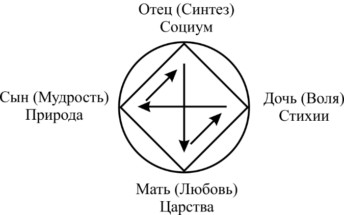 Социум – это Огонь, в этом ромбе, какой? – Синтеза. Увидели? Вспоминайте теперь, Синтеза. То есть, Социум является для человека Синтезом, запомните. Любовь – это Царство. Любовь – Мать.