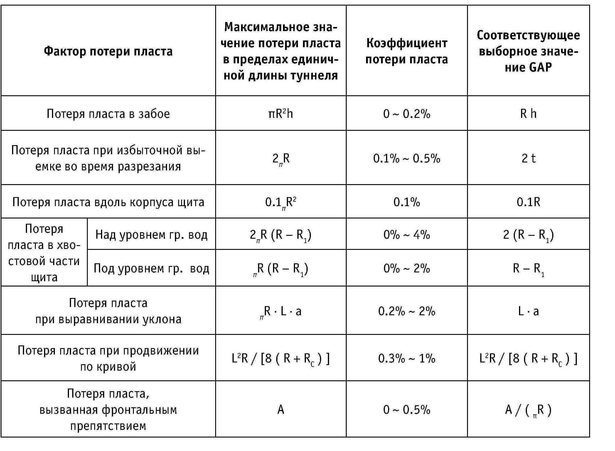 Причина потери грунтовых слоев вследствие проходки щита является многофакторной. В таблице 3-6 перечислены формулы прогнозирования и соответствующие выборные значения GAP для потерь грунтовых слоев всех видов в условиях вязкого грунта.