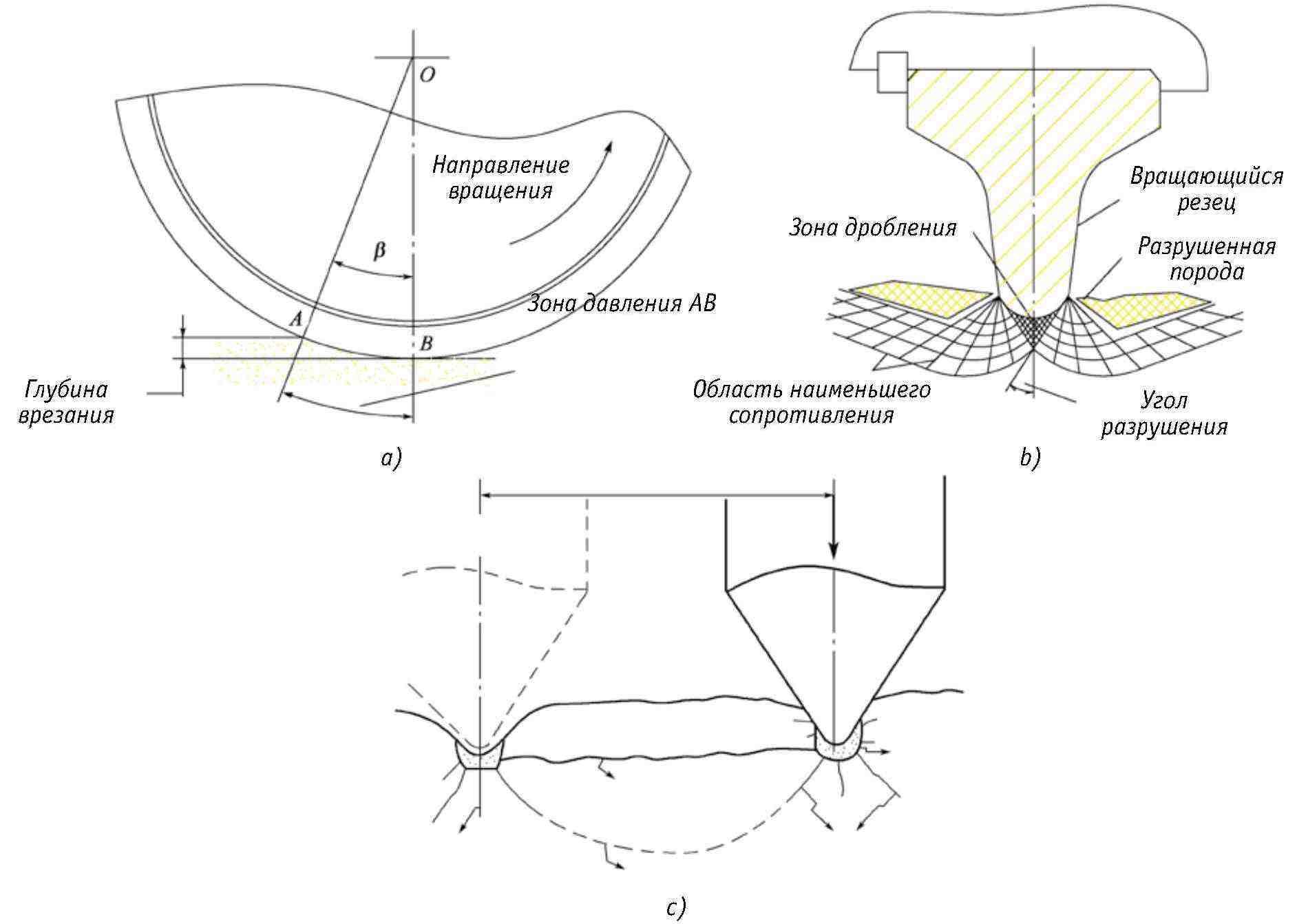 Рис. 6-15. Схематичное изображение механизма разрушения породы червячными фрезами: a) поперечный разрез при действии одного резца; b) продольный разрез при действии одного резца; c) продольный разрез при действии двух резцов