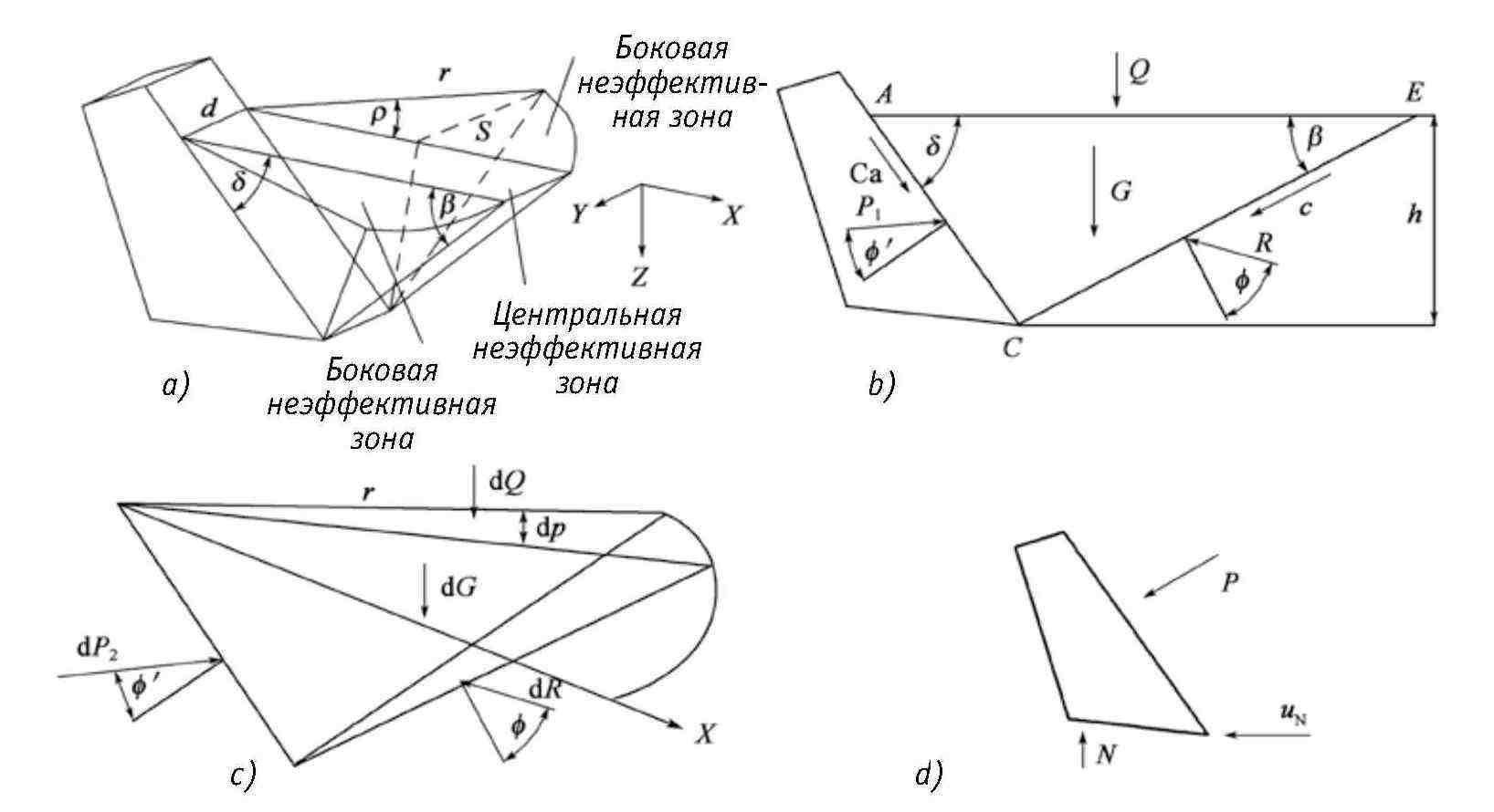 При вращении резцовой головки и продвижении проходческого щита вдоль туннеля резки оказывают сдвигающее усилие на поверхность забоя вдоль туннеля и силу резания по направлению вращения резцовой головки. Острие и головка резца погружается в породу и срезает ее. В зависимости от породы забоя и механических характеристик резков, а также их конструктивных параметров и параметров резки отделяемый пласта разделяют на четыре вида: текучий, разрываемый, скалываемый и срезаемый. Действие резков и грунтовой массы соответствует теории Ренкина о давлении грунта. Грунтовая масса перед резком испытывает пассивное давление грунта. На основании теории Ренкина и модели сопротивления почвообрабатывающих резцов McKyes и Али рассчитано влияние силы трения и вертикальной тяги при резании резками проходческого щита. Создана трехмерная прогностическая модель прямого срезания грунта резками. Неэффективные зоны грунтовой массы (центральная и две зоны в виде полумесяца на боковой части) (рис. 6-17).