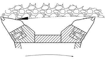 Передний и задний углы резка скошены для срезания твердых пород и сгребания мягкой почвы (рис.6-18). Как показано на рис. 6-19, при проходке грунт со шлаком движется вдоль пунктирной линии и не попадает на нижнюю часть резка, что позволяет избежать порчи резка при проходке твердых пород. Чем дальше расположен резец от центра резцовой головки, тем выше линейная скорость и медленнее траектория движения грунта со шлаком. Таким образом можно увеличить расстояние между двумя резками.