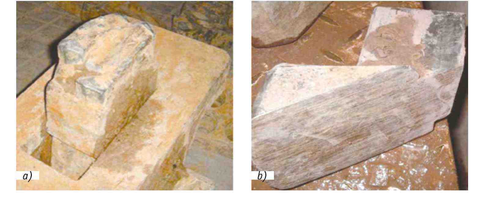 В ходе проходки порода может меняться на более жесткую, и некоторые детали резцовой головки могут оборваться или застрять между породой и резцом. Это может привести к перегрузке и концентрации напряжения на кромке и последующему скалыванию. Кроме того, недостаточное сцепление кромки с телом резца также может привести к разлому (рис. 6-16а).