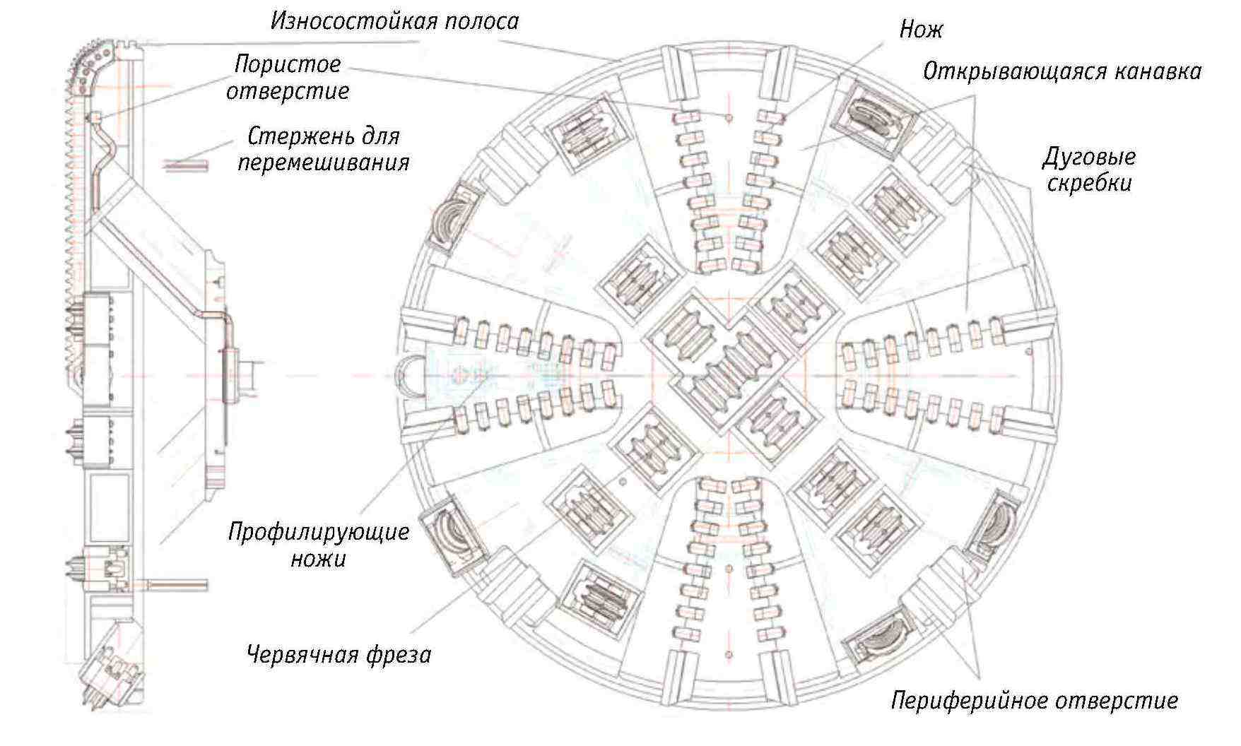 В качестве примера возьмем резцовую головку спицевого типа, как показано на рис. 6-24. Система резцовой головки включает в себя инструменты (такие как червячные фрезы, резак, дуговые скребки, копировальный резак и т. д.) и основную конструкцию резцовой головки. Среди них основной корпус резцовой головки снабжен характерными конструкциями, такими как пористое отверстие, открывающаяся канавка, периферийное отверстие, износостойкая полоса и стержень для перемешивания. Система резцовой головки вместе выполняет следующие три основные функции:
