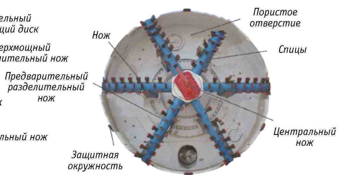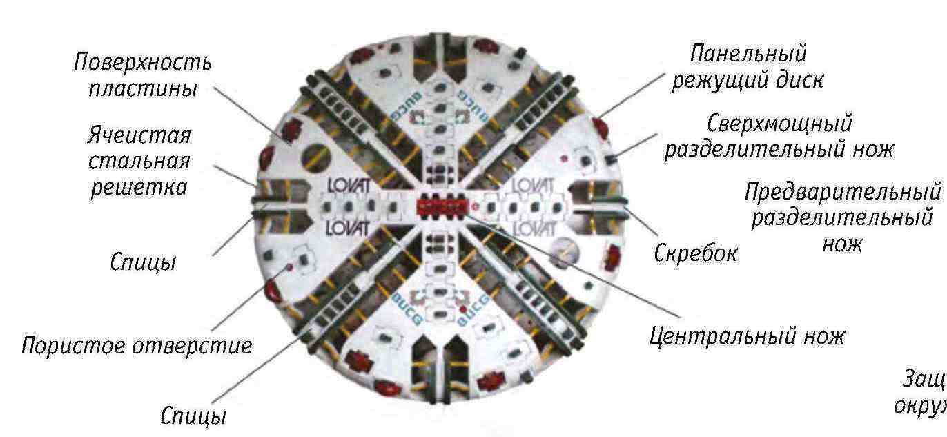 Панельная резцовая головка, показанная на рис. 6-25, проста в установке червячных фрез, поэтому подходит для рытья туннелей, содержащих пласты породы. Опора резцовой головки разделяет почвенный бункер на две части. Преимущества и недостатки:
