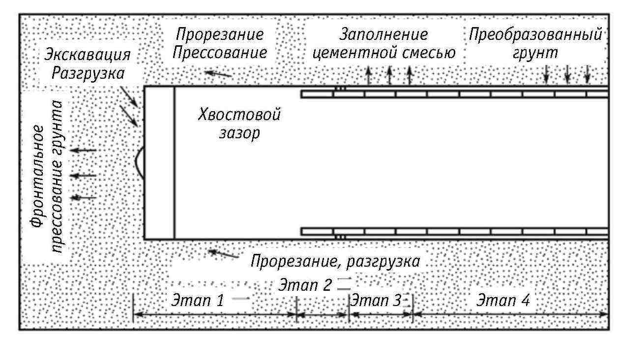 Рис. 2-1. Четыре этапа туннелестроительных работ щитопроходным методом