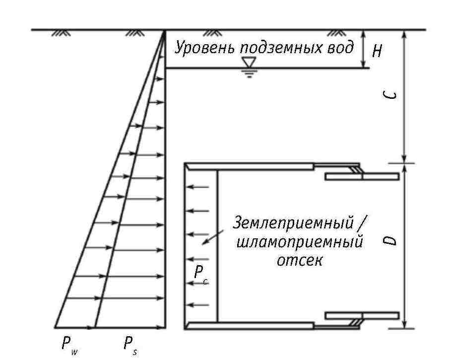 Разрезание земляного пласта вращающейся резцовой головкой является первым шагом щитопроходных работ. На этом этапе щит медленно продвигается вперед, а земля перед ним режется вращающейся резцовой головкой и попадает в землеприемный призабойный отсек (в случае жидкошламовой проходки – попадает в шламовый призабойный отсек), затем по шнеку щита (либо по трубопроводу) выводится на поверхность земли. Успешное прохождение данного этапа играет ключевую роль в сохранении стабильности фронтального земляного пласта. На рис. 2-2 показан силовой анализ воздействия на забой. H – высота уровня подземных вод, С – глубина земляного покрова над щитом, D – диаметр щита, Pw – давление воды, Ps – латеральное (боковое) давление, Pc – давление земляных масс в землеприемном призабойном отсеке (либо давление шламовой жидкости в шламовом призабойном отсеке). Для обеспечения стабильности забоя необходимо обеспечивать достаточное удерживающее усилие.