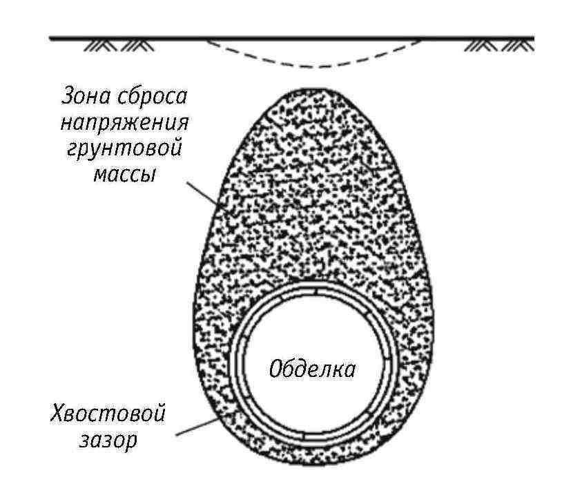 На рис. 2-3 показано, как после удаления корпуса щита от обделки туннеля, вследствие образования зазора в хвостовой части, окружающая грунтовая масса теряет опору и приходит в несбалансированное состояние. В результате естественная регуляция возникшей нагрузки может привести к обвалу окружающих грунтовых масс и деформации туннеля. Поэтому хвостовой зазор необходимо заполнить цементной суспензией.