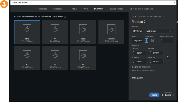 5. Ahora se muestran varios formatos clásicos imprimibles. 3 Por defecto, se encuentra seleccionado el primero de ellos, Carta. En la parte derecha del cuadro puede consultar cuáles son las características del elemento seleccionado y, lógicamente, modificar aquellas que necesite. Cada perfil de documento incluye valores preestablecidos para el tamaño, el modo de color, las unidades, la orientación, la transparencia y la resolución, y todos usan una mesa de trabajo por defecto. (Trataremos las mesas de trabajo en un ejercicio posterior.) Veamos otro ejemplo: pulse sobre la categoría Obra de arte e ilustración y, entre los documentos disponibles, pulse sobre el formato A3.