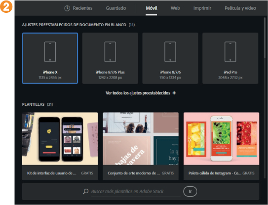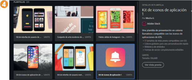 COMO HEMOS PODIDO COMPROBAR en el ejercicio anterior, Illustrator cuenta con una larga lista de ajustes preestablecidos para la creación de nuevos documentos según la finalidad del diseño que el usuario debe realizar. Sin embargo, no es esta la única ayuda disponible para empezar: el programa se integra por completo con Adobe Stock. Adobe Stock es un inmenso catálogo de plantillas creadas por profesionales que incluye recursos e ilustraciones que el usuario puede tomar como base para la elaboración de sus diseños.