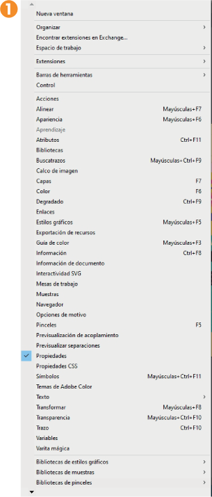 2. Imagine que en esta disposición de elementos tan básica (y a la vez tan útil) le iría muy bien añadir, por ejemplo, el ya mencionado Panel de control. Quizá le resulta más intuitivo contar con las características del elemento seleccionado en la parte superior de la ventana en lugar de a la derecha en forma de panel. Si desea mostrar un panel que, por defecto, se encuentra oculto, despliegue el menú Ventana. 1