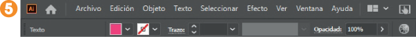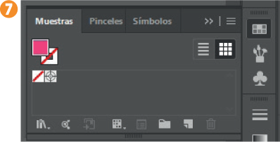 3. Al instante, los elementos de la interfaz cambian ligeramente. Puede ver el Panel de control debajo de la Barra de menús, con todas las características del elemento seleccionado, en este caso, del texto seleccionado, tal y como se indica en la parte izquierda del panel. 5 Como variación, también se recupera la barra de paneles, es decir, la barra que contiene todos los paneles disponibles en Illustrator, pero que, seguramente, usted no utiliza siempre. 6 El espacio de trabajo Aspectos esenciales solo activa los tres más esenciales: Propiedades, Capas y Bibliotecas. Todos los paneles excepto dos se encuentran ocultos; para mostrarlos, simplemente debe pulsar sobre el que necesite. Por ejemplo, haga clic sobre el tercero de los iconos de la barra de paneles para ver, en este caso, el panel Muestras. 7