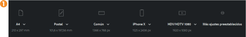 2. En esta pantalla, usted puede elegir entre distintos documentos con una serie de ajustes preestablecidos. ¿Qué tipo de ajustes? Sobre todo de forma y tamaño. A simple vista, puede ver cinco tipos de documentos, todos ellos con nombres explícitamente descriptivos: A4, Postal, Común, iPhoneX y HDV/HDTV 1080. Este último es óptimo para la creación de películas y videos. 1 Solo con pulsar uno de estos formatos de documento, Illustrator lo cargará en el área de trabajo del programa.