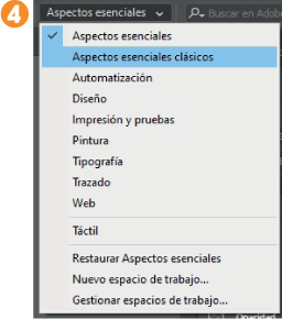 7. Por el momento mantiene el mismo aspecto personalizado. Para restaurarlo, despliegue de nuevo el menú de espacios de trabajo y elija la opción Restaurar Aspectos esenciales. 7