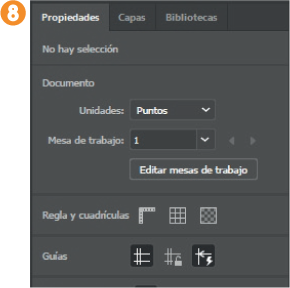 7. El lienzo en blanco elegido se muestra en el área de trabajo de Illustrator, listo para que usted le agregue contenido. Vea que el nombre preestablecido aparece en la pestaña del documento, en la que tambien puede leer el nivel de zoom aplicado y el modo de color. Por su parte, el panel Propiedades refleja las principales características de formato del documento elegido, como las unidades o las guías activas. Más adelante veremos cómo almacenar los documentos, aunque, si desea hacerlo en estos momentos, no dude en consultar el ejercicio titulado “Guardar ilustraciones”. En el ejercicio siguiente veremos cómo puede empezar un diseño a partir de una plantilla.