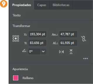 2. Ahora sí, para poder comprender mejor lo que decíamos, seleccione con un clic una de las letras del texto que aparece sobre la ilustración 3. Observe que las características del elemento seleccionado se muestran ahora en el panel Propiedades. En versiones anteriores, la selección del texto o de cualquier otro elemento habría activado el Panel de control. Cambiaremos de espacio de trabajo para comprobarlo. En el extremo derecho de la Barra de menús, despliegue el campo que muestra el texto Aspectos esenciales (el nombre del espacio de trabajo predeterminado y activo en estos momentos) y elija de la lista la opción Aspectos esenciales clásico. 4