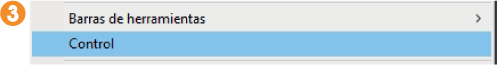 3. Esta es la larga lista de paneles y otros elementos que se pueden mostrar y ocultar en un espacio de trabajo. Aquellos que ya están activos muestran un signo de verificación junto a su nombre. 2 En este caso, para mostrar el panel de control, haga clic sobre la opción Control en el grupo de barras de herramientas de este menú. 3