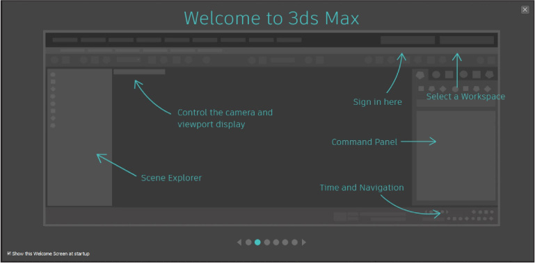2. El programa se abre y muestra una pantalla de bienvenida que recoge, a modo de diapositivas, algunas informaciones prácticas. Esta ventana aparecerá cada vez que inicie 3ds Max, pero, si desea que no lo haga, simplemente desactive la opción Show this Welcome Screen at startup. Una vez consultada la información proporcionada en esta pantalla, ciérrela pulsando en el botón de aspa situado en la esquina superior derecha de dicha pantalla.