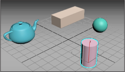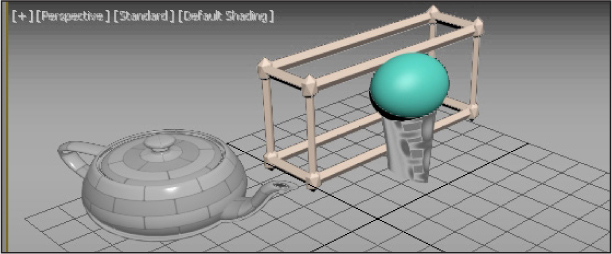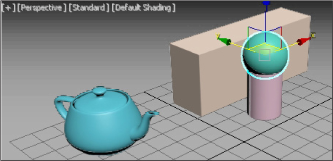 8. Por último, aplicaremos un tercer modificador a dos objetos distintos a la vez: la esfera y el cilindro. Para ello, deberá seleccionar de forma previa los dos objetos y trabajar sobre ambos simultáneamente. Sepa que más adelante en este libro conocerá todos los detalles acerca de la selección de objetos en 3ds Max. Haga clic sobre la esfera y, pulsando la tecla Control, haga clic sobre el cilindro en el visor activo.