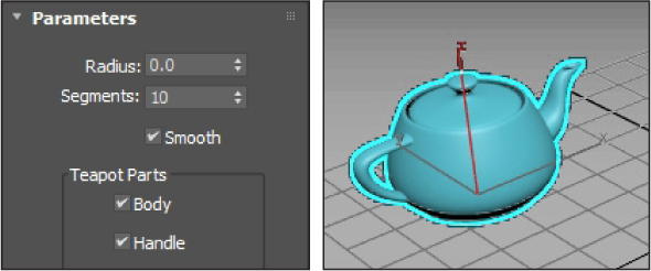 13. Para que la tetera tenga un mejor aspecto en el momento del renderizado, va a aumentar su definición. Esto se consigue incrementando el valor Segments, aunque tiene que ser cuidadoso, porque la mejor definición siempre conlleva aumentar el tiempo de cálculo de la escena. Introduzca el valor 10 en el campo Segments de la persiana Parameters.
