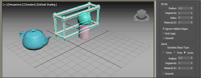 5. Mantendremos el resto de opciones de este apartado con sus valores por defecto. En el apartado Joints del panel, cambiaremos la forma de las juntas que componen nuestro objeto y modificaremos también su grosor. Para ello, seleccione la opción Icosa del apartado Geodesic Base Type y, tras comprobar el cambio conseguido, asigne el valor 2 como radio.
